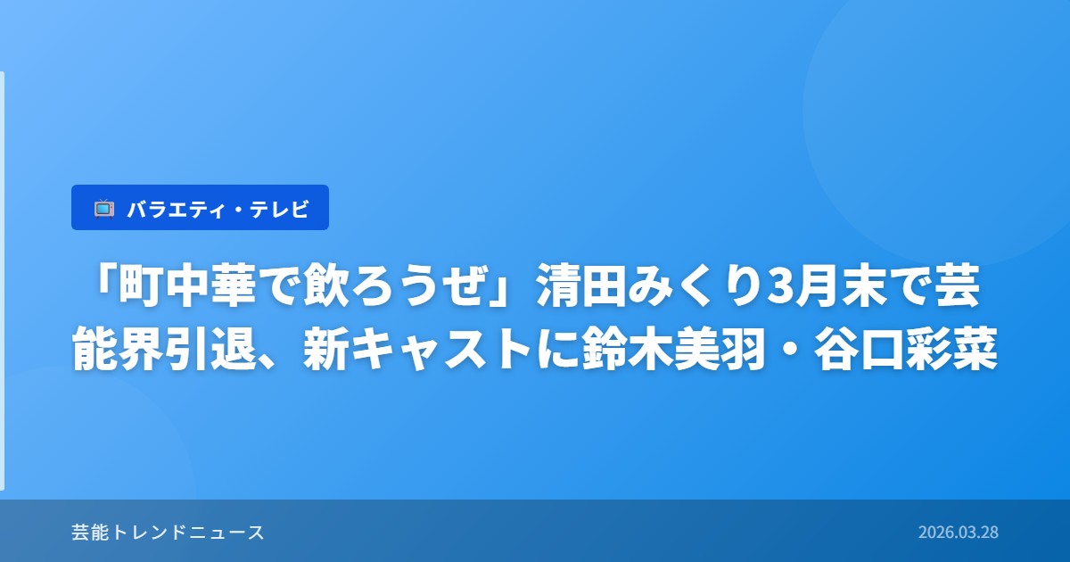 BS-TBSの人気グルメバラエティ番組「町中華で飲ろうぜ」で大きな変化が起こっている。同番組の二期生として出演していた清田みくりが3月末で芸能界を引退することが発表された。一方で、後任として鈴木美羽と谷口彩菜が新たに三期生として加入することも同時に明らかになった。8年目を迎える長寿番組にとって、キャスト交代は新たな展開を迎える重要な転換点となっている。