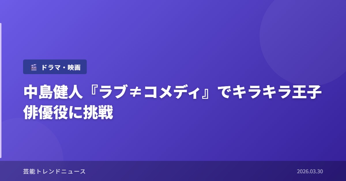 元Sexy Zoneのメンバーとして活動し、現在はソロで俳優業を中心に活躍している中島健人の主演映画『ラブ≠コメディ』の詳細が発表された。この作品で中島は、これまでとは一線を画す「ラブコメ嫌いなキラキラ王子俳優」という複雑な役柄に挑戦することが明らかになった。ヒロインには元欅坂46の長濱ねるが抜擢され、2人の初共演作品として話題を呼んでいる。映画界においても注目度の高いオリジナルラブコメディとして、2026年7月3日の全国公開が決定している。