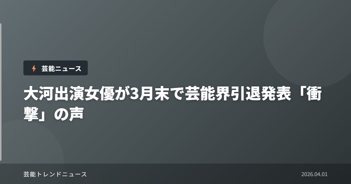 NHK大河ドラマへの出演歴を持つ女優が、3月末をもって芸能界から引退することを発表し、エンタメ業界に大きな衝撃を与えています。この突然とも言える発表に対し、ファンからは「衝撃的すぎる」「寂しすぎる」といった驚きと惜しむ声が数多く寄せられています。長年にわたって多くの作品で活躍してきた女優の引退発表は、芸能界全体にとっても大きな損失として受け止められています。今回の引退発表の詳細と、これまでの輝かしいキャリアについて詳しく見ていきます。